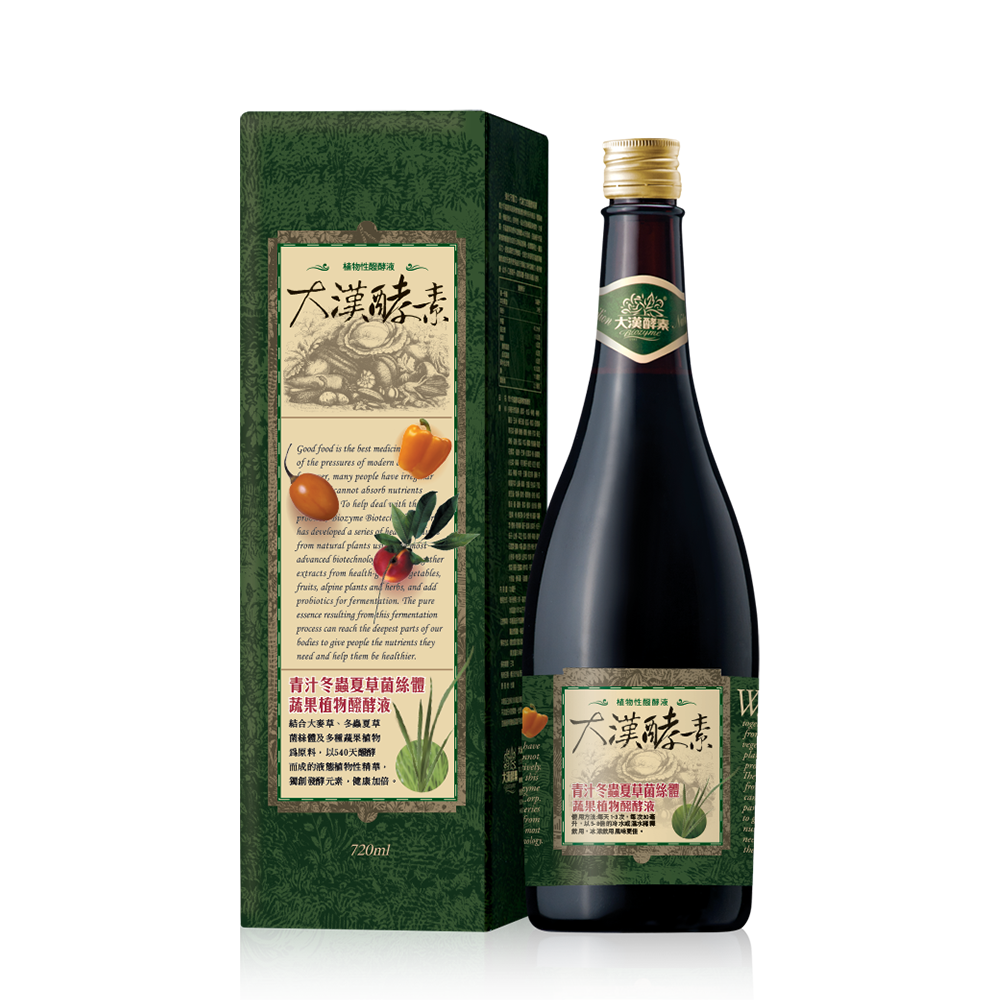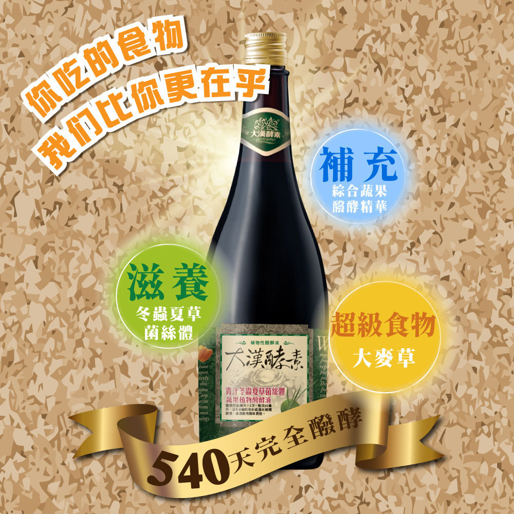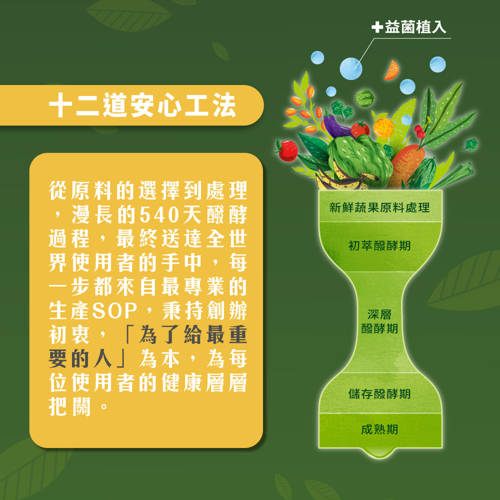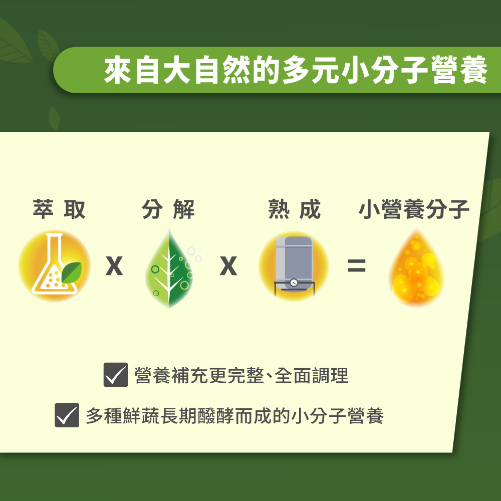 ■成份來源:蔬果醱酵液(鳳梨、番薯、檸檬、番茄、番石榴、甜瓜、南瓜、青花菜、蘋果、葡萄、楊桃、芥菜、黃豆、甜椒、西瓜、木瓜、蘿蔔、馬鈴薯、萵苣、花椰菜、梅子、胡蘿蔔、小白菜、黃瓜、蕪菁、山藥、甘藍、空心菜、芥藍、葡萄柚、金桔、絲瓜、生薑、菠菜、小黃瓜、水梨、蓮霧、青椒、青江菜、番薯葉、苦瓜、小松菜、胡瓜、哈密瓜、瓠瓜、芹菜、隼人瓜、冬瓜、印度棗、木薯、蘆筍、酪梨、甜菜根、諾麗果、豆瓣菜、黑木耳、百香果、紅鳳菜、枇杷、釋迦、美國芹菜、香蕉、酸橘、椰子、綠豆、豆薯、豌豆苗、桃子、菱角、昆布、龍鬚菜、莧菜、紫菜、黑豆、柳橙、龍眼、芒果、蓮藕、芋頭、火龍果、紫蘇、荔枝、香菇、金針菇、柿子、李子、奇異果、茄子、白菜、柑橘、玉米、桑椹、草莓、紅豆、豌豆、牛蒡、甘蔗、蘆薈、櫻桃、蓮子、藍莓、菜豆)、異麥芽寡糖、大麥草粉(含葉綠素Chlorophyll)、冬蟲夏草菌絲體(中華被毛孢Hirsutella sinensis,液態發酵菌絲體)