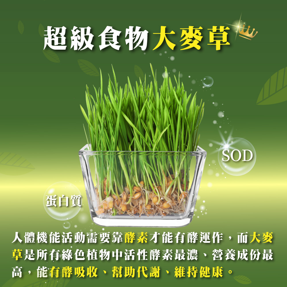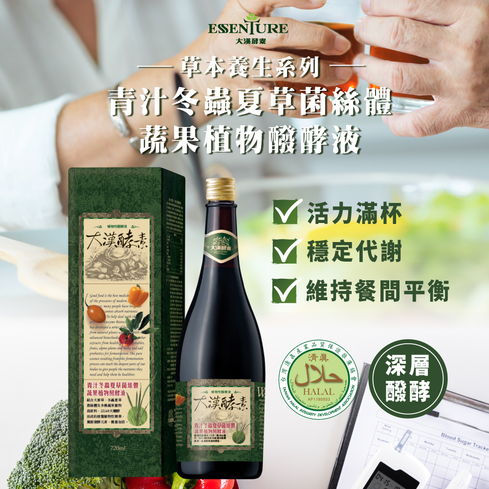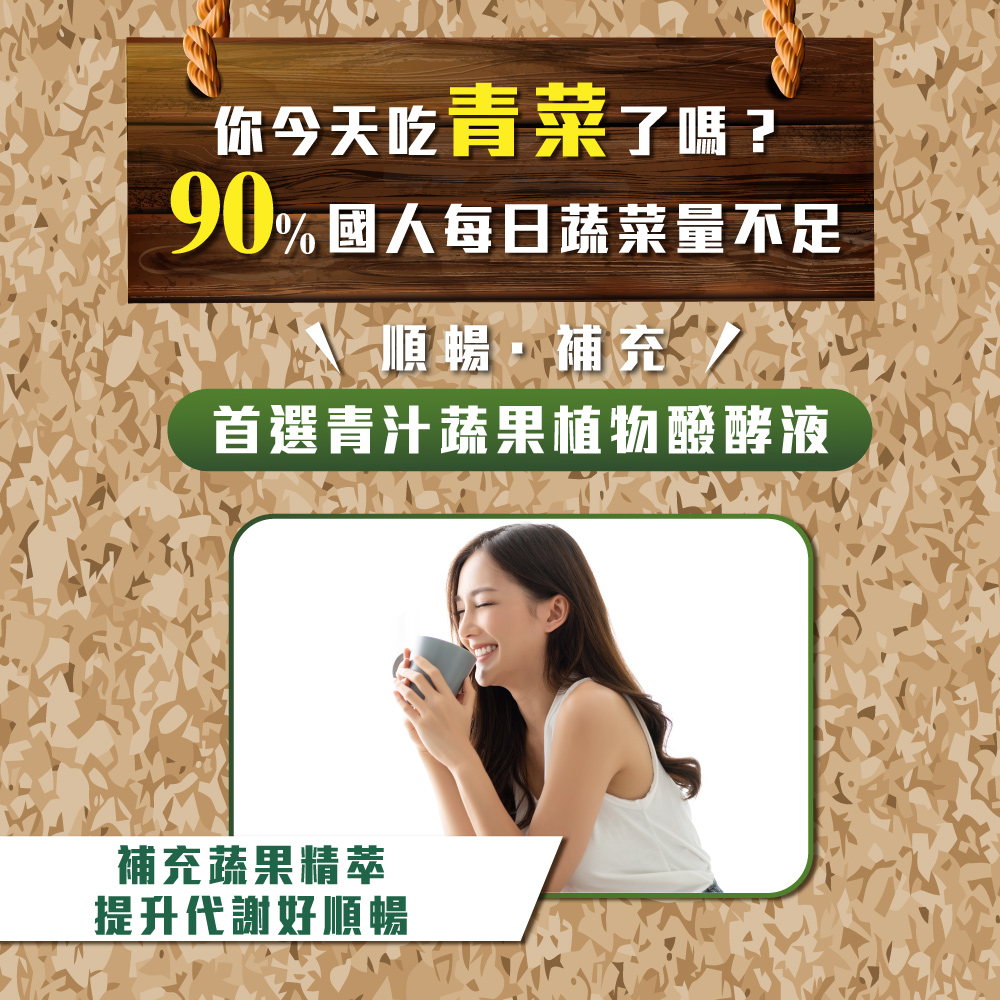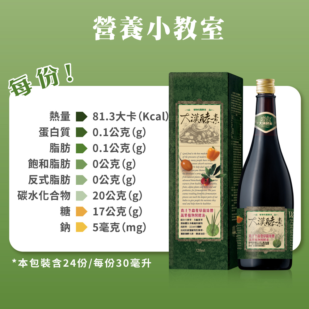 ■成份來源:蔬果醱酵液(鳳梨、番薯、檸檬、番茄、番石榴、甜瓜、南瓜、青花菜、蘋果、葡萄、楊桃、芥菜、黃豆、甜椒、西瓜、木瓜、蘿蔔、馬鈴薯、萵苣、花椰菜、梅子、胡蘿蔔、小白菜、黃瓜、蕪菁、山藥、甘藍、空心菜、芥藍、葡萄柚、金桔、絲瓜、生薑、菠菜、小黃瓜、水梨、蓮霧、青椒、青江菜、番薯葉、苦瓜、小松菜、胡瓜、哈密瓜、瓠瓜、芹菜、隼人瓜、冬瓜、印度棗、木薯、蘆筍、酪梨、甜菜根、諾麗果、豆瓣菜、黑木耳、百香果、紅鳳菜、枇杷、釋迦、美國芹菜、香蕉、酸橘、椰子、綠豆、豆薯、豌豆苗、桃子、菱角、昆布、龍鬚菜、莧菜、紫菜、黑豆、柳橙、龍眼、芒果、蓮藕、芋頭、火龍果、紫蘇、荔枝、香菇、金針菇、柿子、李子、奇異果、茄子、白菜、柑橘、玉米、桑椹、草莓、紅豆、豌豆、牛蒡、甘蔗、蘆薈、櫻桃、蓮子、藍莓、菜豆)、異麥芽寡糖、大麥草粉(含葉綠素Chlorophyll)、冬蟲夏草菌絲體(中華被毛孢Hirsutella sinensis,液態發酵菌絲體)