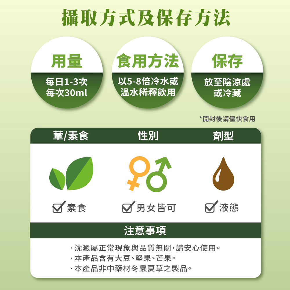 ■注意事項:1.沈澱屬正常現象與品質無關,請安心使用。2.本產品含有芒果,不適合其過敏體質者食用。3.本產品非中藥材冬蟲夏草之製品。