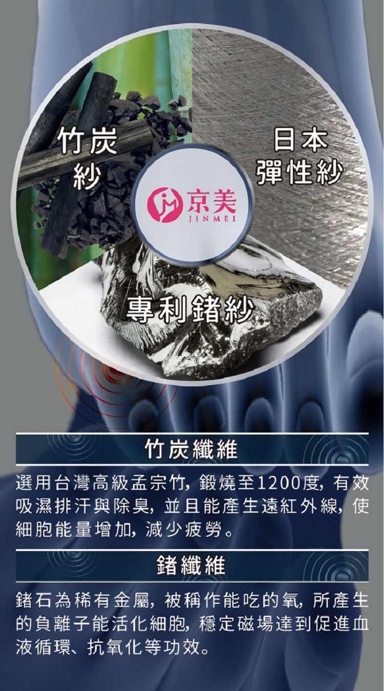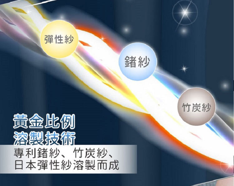 材質:鍺(全效機能紗)16%,彈力紗11%,聚酯纖維(含竹炭)21%,尼龍52%