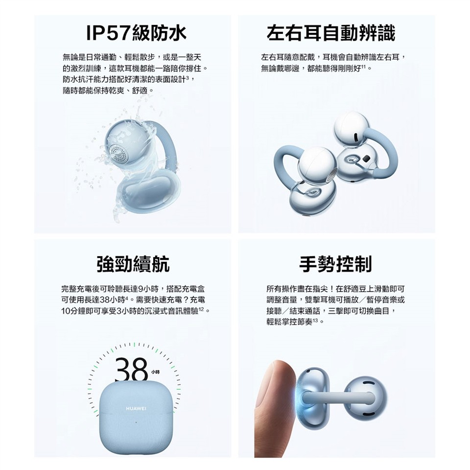 內容配件:耳機 × 1 對(左右耳各一隻)、充電盒 × 1、快速入門指南 & 安全資訊説明 × 1 套、保修卡 × 1